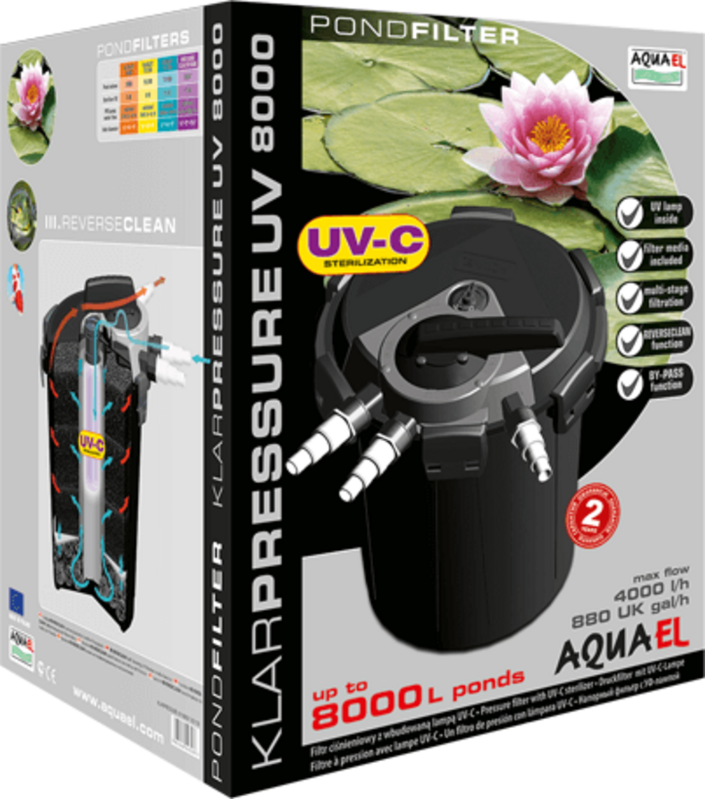 Tlakový UV filter KLARPRESURE sa používa na komplexnú úpravu vody vo vodných nádržiach s objemom do 8000 litrov. Filter ponúka trojstupňovú filtráciu. Okrem mechanickej a biologickej filtrácie sterilizuje vodu pomocou UVC lampy s výkonom 11 W (ktorá zabraňuje zakaleniu vody a bojuje proti riasam a nebezpečným parazitom). Maximálny prietok je 4000 l/h.
