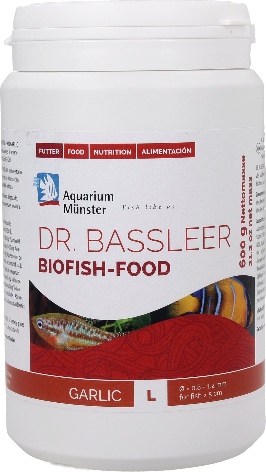 DR. BASSLEER BIOFISH FOOD GARLIC obsahuje prírodný cesnak. Krmivo ochotne konzumujú aj okrasné ryby, ktoré sú už choré a často trpia stratou chuti do jedla. Cesnak obsahuje prírodnú rastlinnú látku alicín, ako aj veľmi vysoký podiel mangánu, vitamínu B6, mimoriadne vysoký počet stopových prvkov (selén, jód, germánium atď.) a enzýmov. V záujme zachovania cenných zložiek sa po procese granulácie pridáva len čerstvý cesnak (žiaden granulát).
