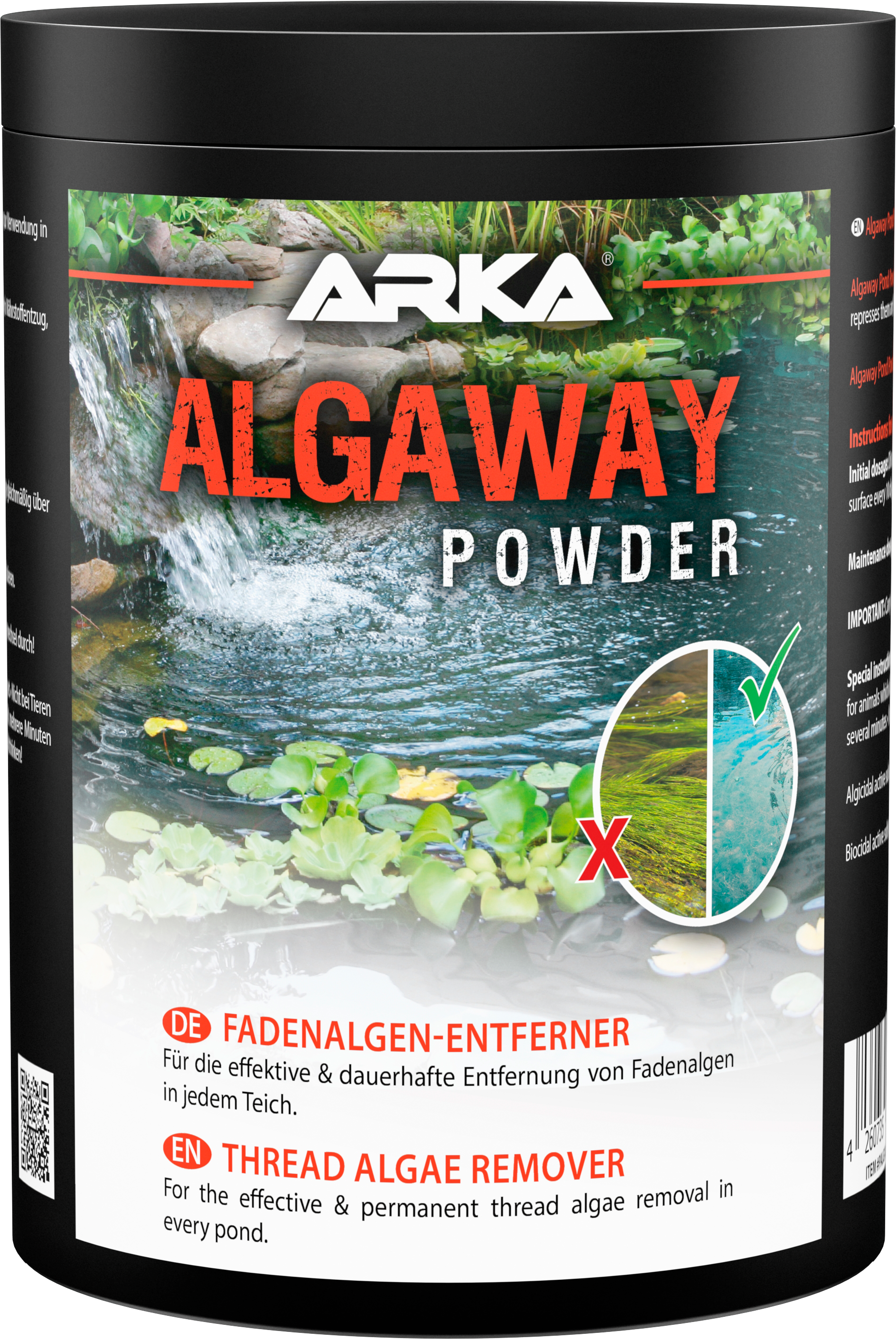 Praktický Algaway Powder značky ARKA je inovatívny odstraňovač vláknitých rias, ktorý možno použiť vo všetkých rybníkoch! Je mimoriadne rýchly a účinný, pretože zastavuje rast existujúcich vláknitých rias tým, že z nich odstraňuje živiny. Riasy sú potlačené a trvalo sa bráni ich novej tvorbe.