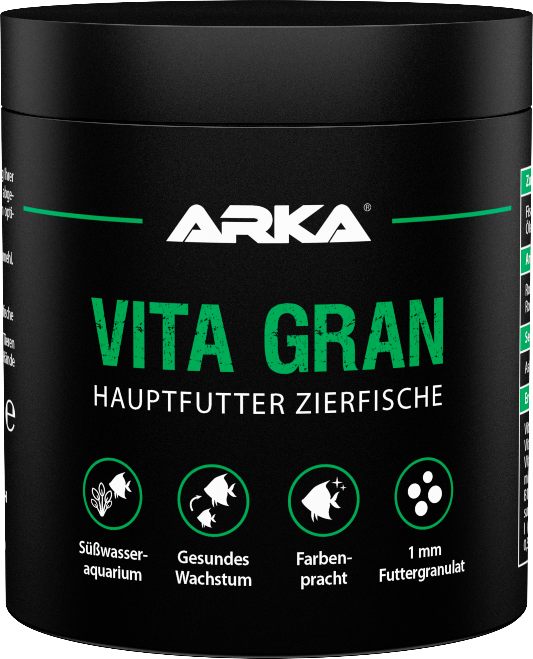 VitaGran je základným krmivom pre okrasné ryby v sladkovodných akváriách a kombinuje zložky najvyššej kvality, ktoré podporujú zdravý rast, prirodzené sfarbenie a znižujú vylučovanie na minimum. Vyrába sa procesom lisovania za studena, ktorý zachováva vitamíny. Neobsahuje spirulinu (sinice) ani podradnú rybiu múčku.