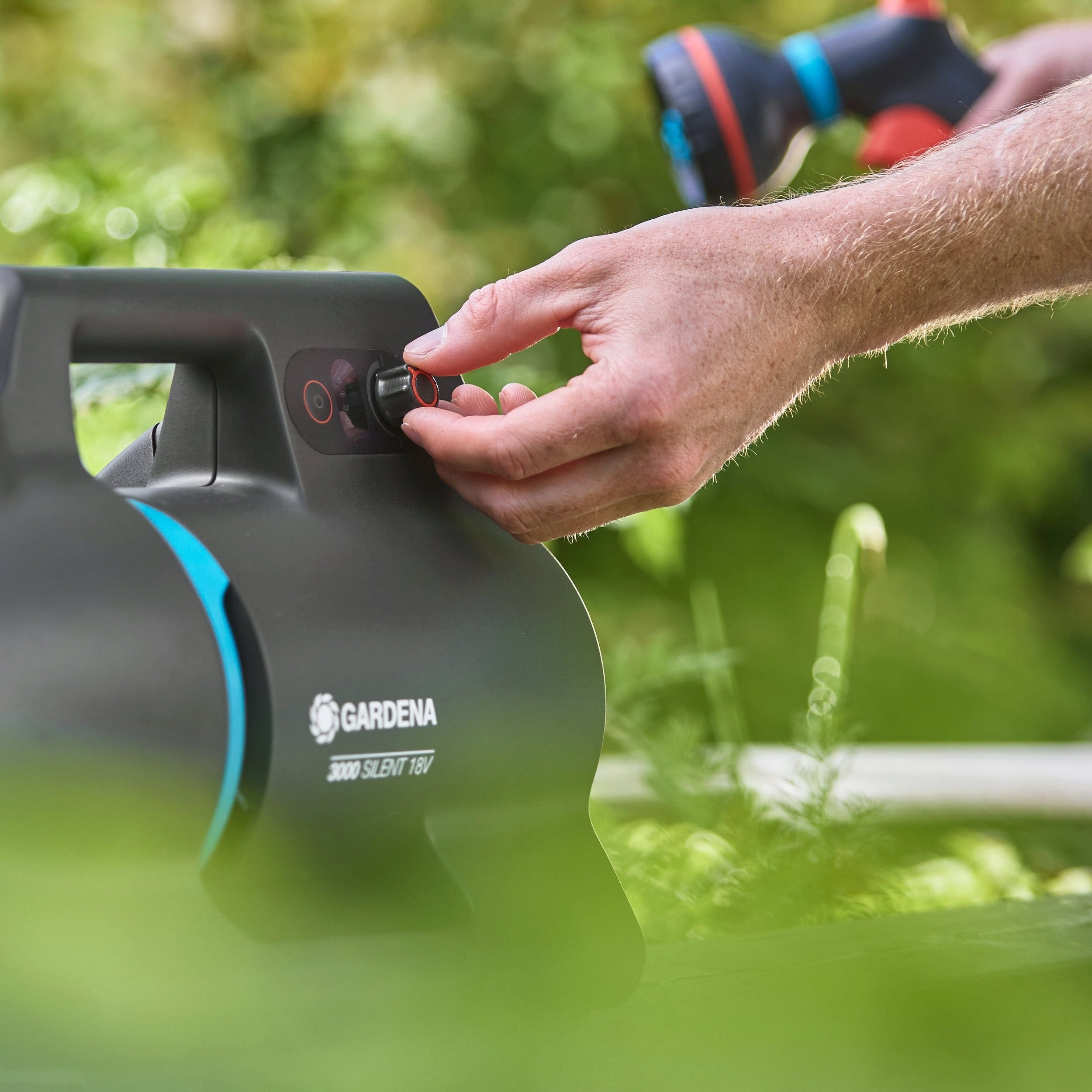 Používajte studne, cisterny alebo sudy na dážď flexibilnejšie ako kedykoľvek predtým! So súpravou GARDENA 3000 s nabíjateľným záhradným čerpadlom pripravenou na použitie môžete začať ihneď. Čerpadlo s tlakom 3,0 bar poskytuje dostatočný tlak na všetky bežné zavlažovacie úlohy. Vďaka inovatívnej tichej technológii pracuje tak nenápadne, že je na vzdialenosť 10 metrov sotva hlasnejšie ako moderná chladnička.