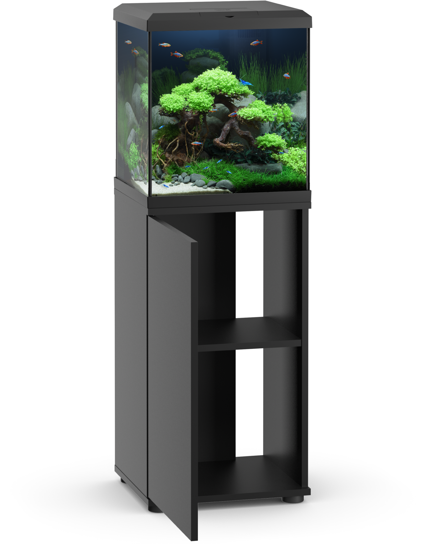 Jednoduchá montáž zaručuje, že váš nový akváriový projekt bude pripravený v priebehu chvíľky. Za nepriehľadnými dvierkami nájdete aj dostatok úložného priestoru na príslušenstvo a krmivo.