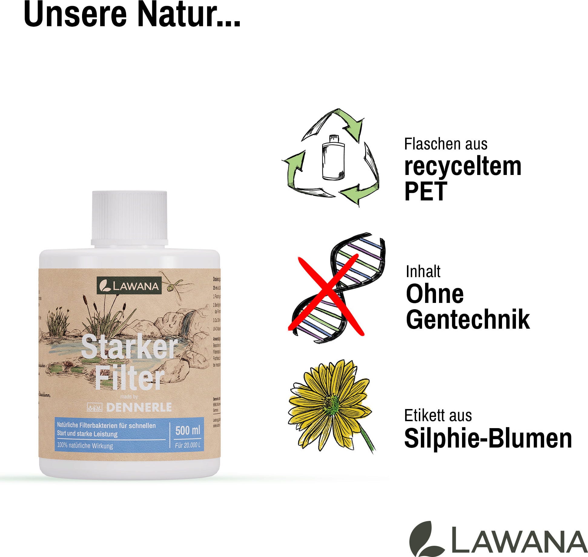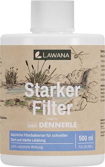 S produktom "Silný filter" od spoločnosti LAWANA môžete optimalizovať srdce svojho záhradného jazierka a zabezpečiť výkonnú biologickú aktiváciu filtračného systému! Vysoko koncentrovaný roztok s viac ako 100 miliónmi prírodných baktérií na mililiter enormne urýchľuje štartovaciu fázu nových jazierok a zvyšuje účinnosť existujúcich systémov tým, že rozkladá organickú záťaž, ako sú tuky, bielkoviny a sacharidy, priamo vo filtri.