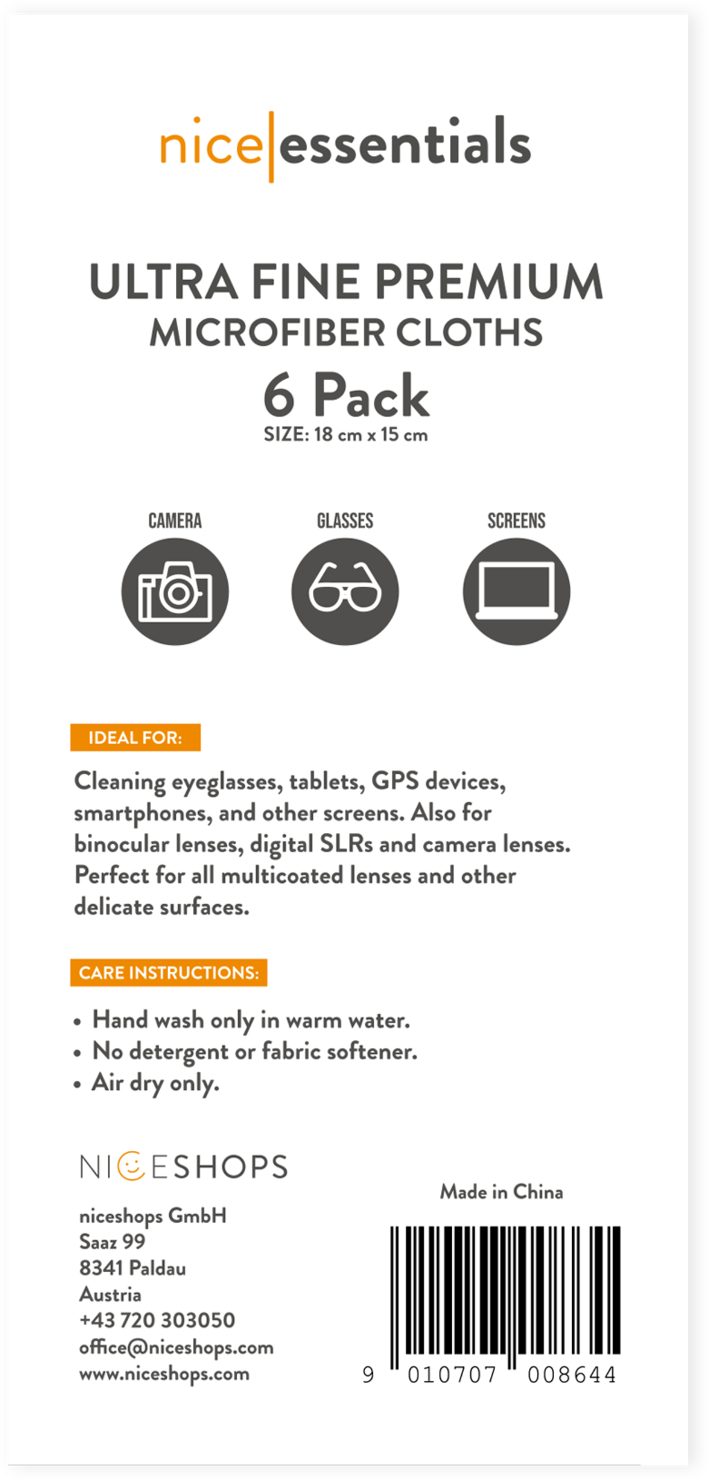 Ultrajemné čistiace utierky z mikrovlákna nice essentials sú ideálne na dôkladné a šetrné čistenie citlivých povrchov, ako sú okuliare, displeje alebo šošovky fotoaparátov. Vysokokvalitný, husto tkaný materiál z mikrovlákna spoľahlivo priťahuje prach, nečistoty a olej a odstraňuje nepríjemné odtlačky prstov - bez škrabancov a chuchvalcov.