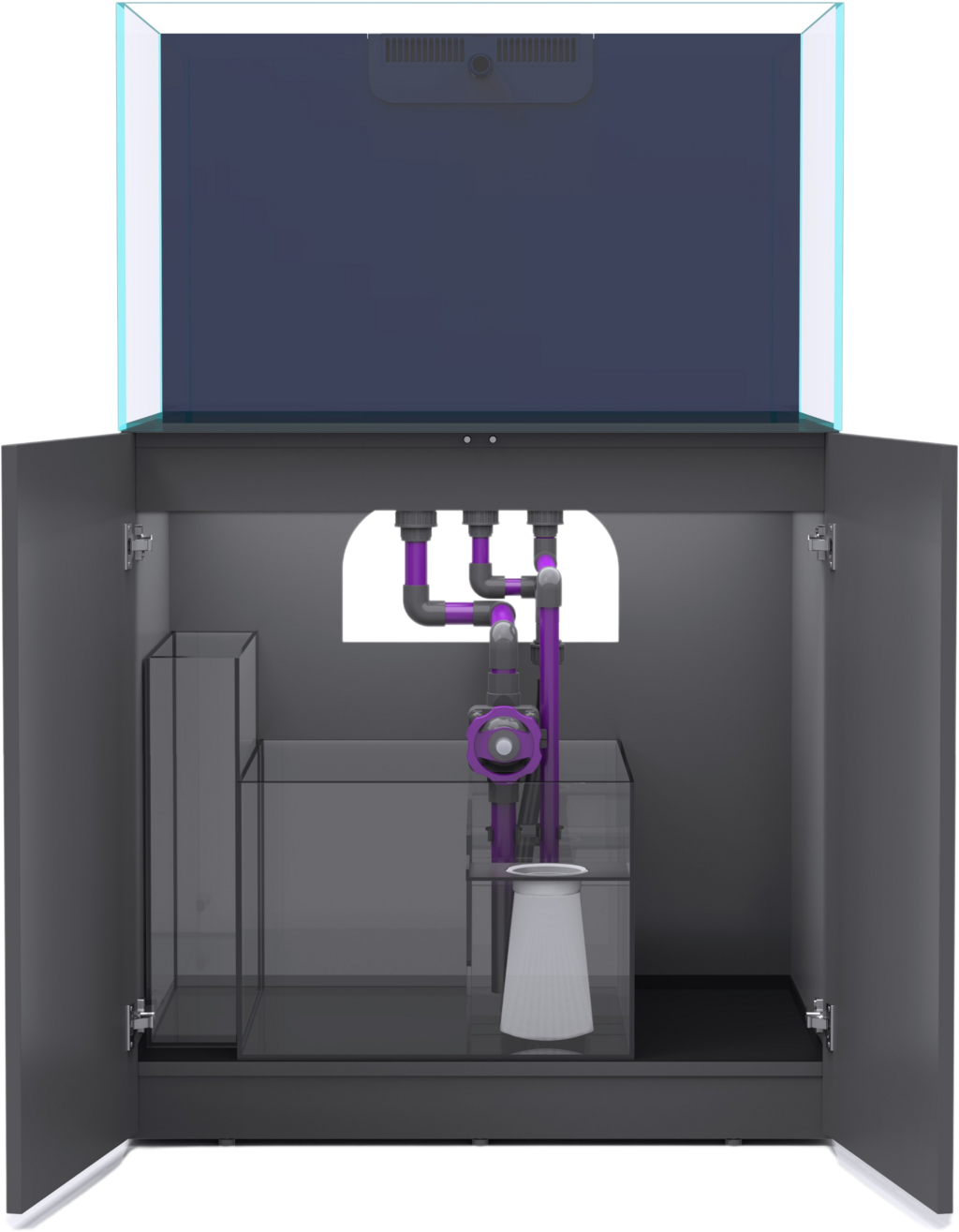 Stredobodom akvária je priestranná technická nádrž, ktorá je ukrytá v spodnej skrinke. Na rozdiel od iných akvárií s hadicovými inštaláciami, disponuje OPUS G2 odolnou, priestorovo úsporne usporiadanou PVC potrubnou inštaláciou, ktorá sa ľahko montuje. Priestranná hlavná komora má priestor pre niekoľko zariadení, ako sú fluidné filtre, reaktory na riasy alebo skimmery, pričom ponúka stálu hladinu vody približne 21 cm. Vypúšťanie možno regulovať vďaka ventilu, aby sa znížila hlučnosť a k dispozícii je aj núdzové vypúšťanie. XL nádrž na doplňovanie vody má výšku 50 cm a poskytuje vodu na doplnenie vyparenej vody na celý týždeň. Konštrukacia na princípe 5 komôr: