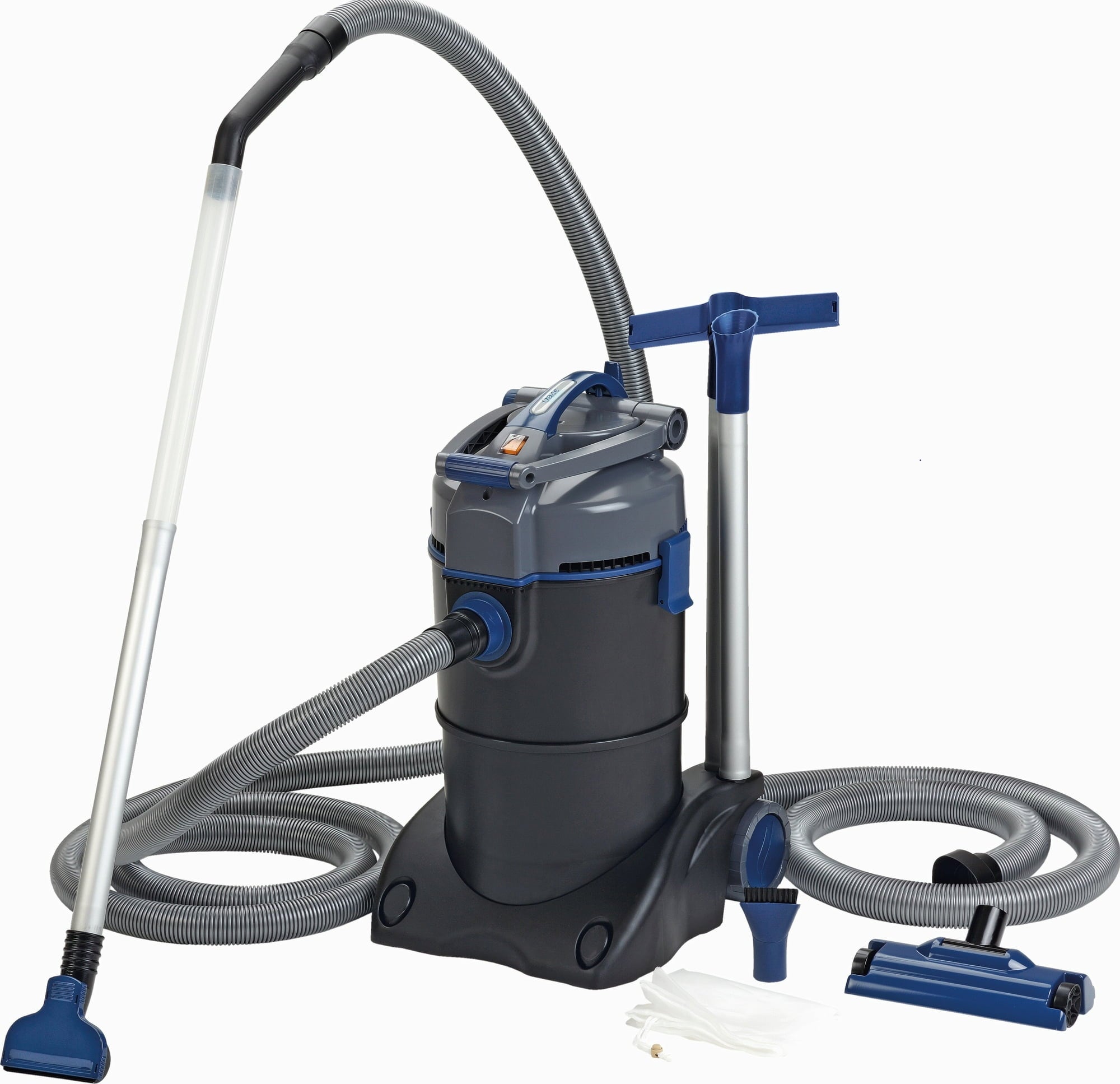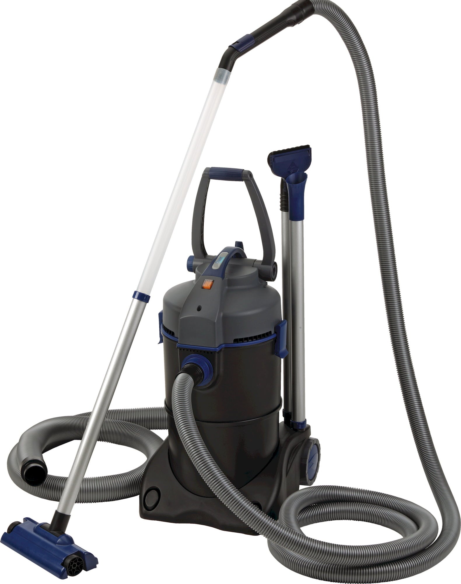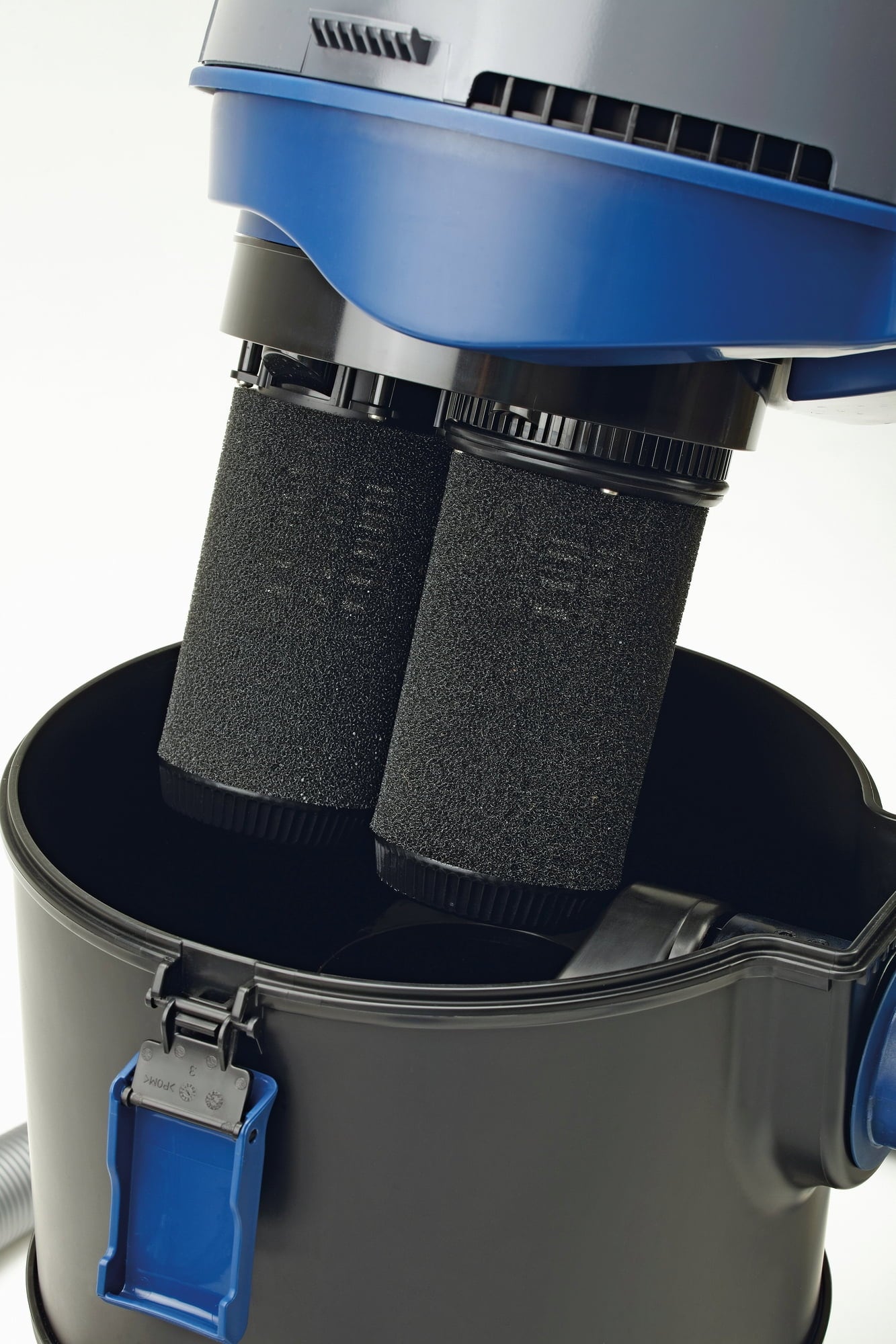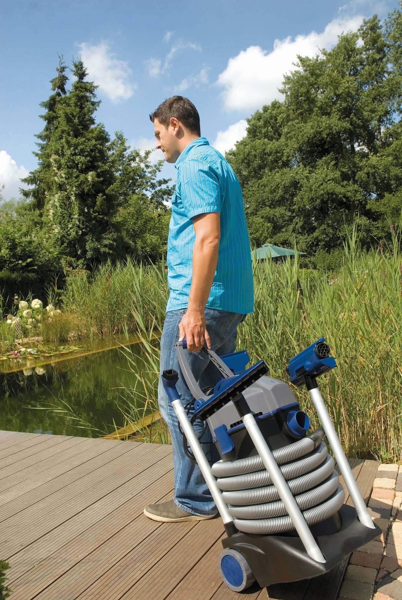 Dvojkomorový systém funguje prostredníctvom dvoch valcov rovnakej veľkosti: pracujú súčasne s plnením a vyprázdňovaním s mimoriadne výkonným vysávaním. Ak chcete vyčistenú vodu vrátiť do záhradného jazierka, vrecko na zachytávanie nečistôt zadrží hrubšie častice (> 1 mm). Sada nadstavcov obsahuje trysku na mokré vysávanie, univerzálnu trysku, špeciálnu trysku na riasy, plošnú trysku a kefovú trysku.