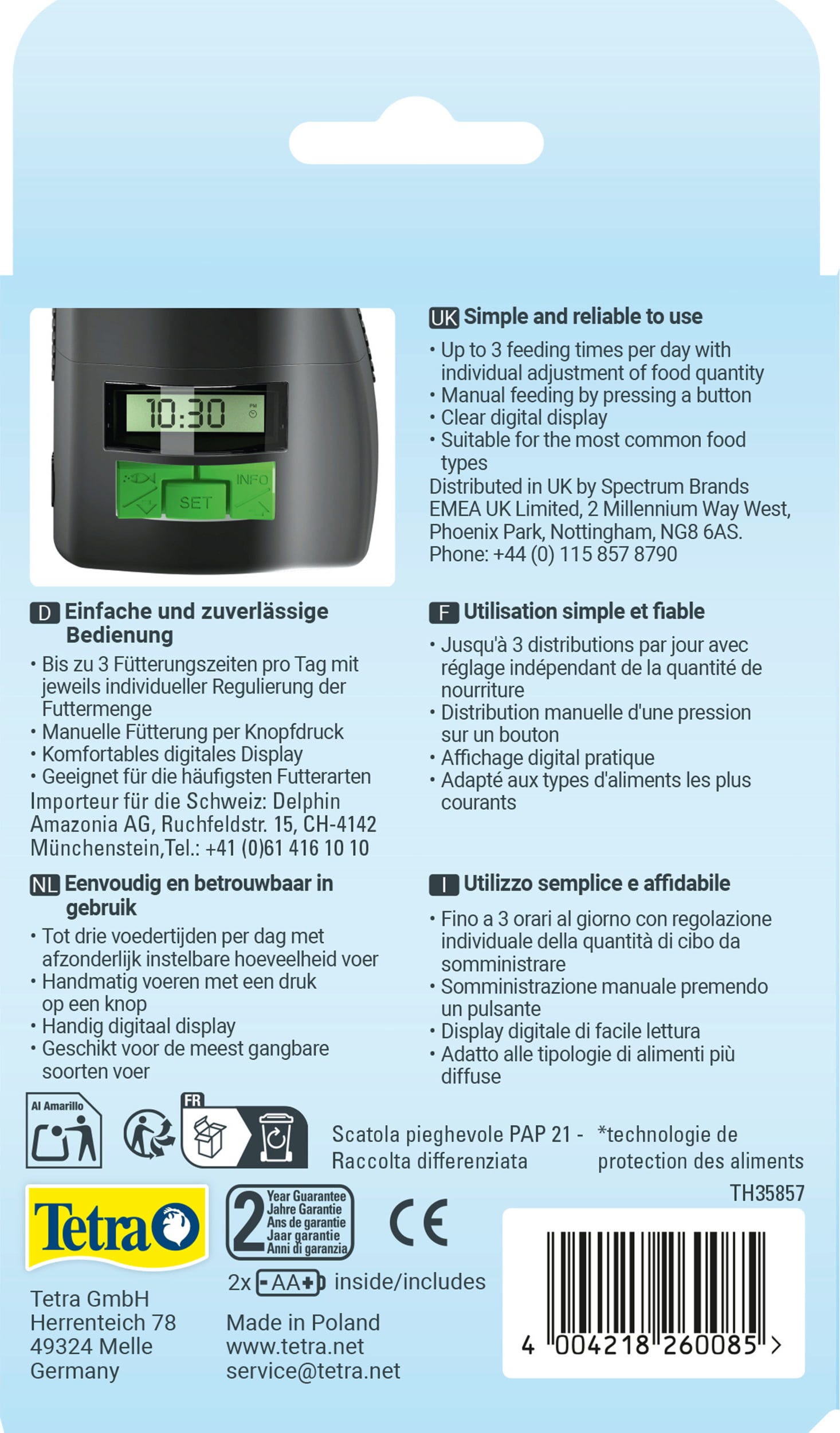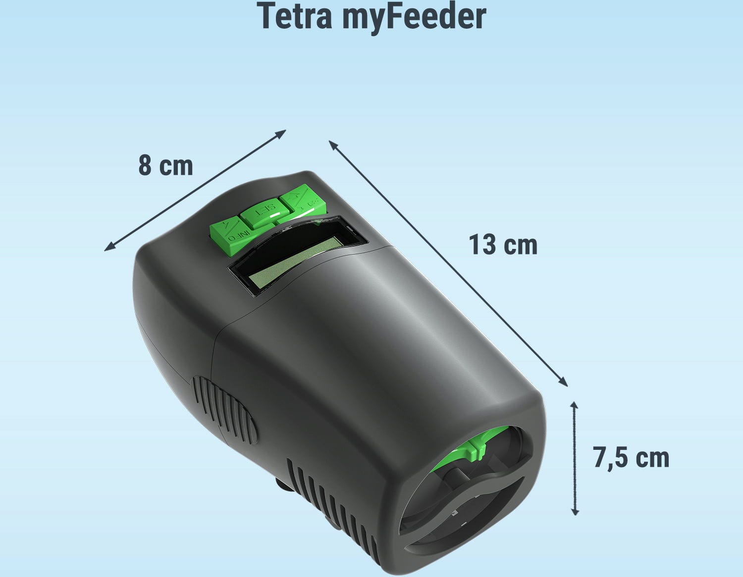 S Tetra myFeeder je o vaše okrasné ryby optimálne postarané počas vašej neprítomnosti. Ľahko ovládateľné a spoľahlivé automatické kŕmidlo slúži na individuálne a cielené kŕmenie rýb. Krmivo je bezpečne chránené pred svetlom, vzduchom a vlhkosťou unikátnym systémom dvojitého krytu. Programovanie je jednoduché a nekomplikované pomocou digitálneho displeja. Individuálne množstvo krmiva je možné regulovať: buď až tri kŕmenia denne individuálnym množstvom krmiva alebo jednorazovo stlačením tlačidla. Objem kŕmnej komory zodpovedá 100 ml, je vzduchotesne uzavretý a je vhodný pre najbežnejšie druhy krmív ako sú granule, vločky alebo chrumky. Tetra myFeeder má multifunkčné možnosti uchytenia na okraji akvária. Priehľadné okienko vám umožňuje kontrolovať úroveň naplnenia a úroveň nabitia batérií. Súčasťou dodávky sú 2 batérie VARTA, ktoré majú dlhú životnosť.