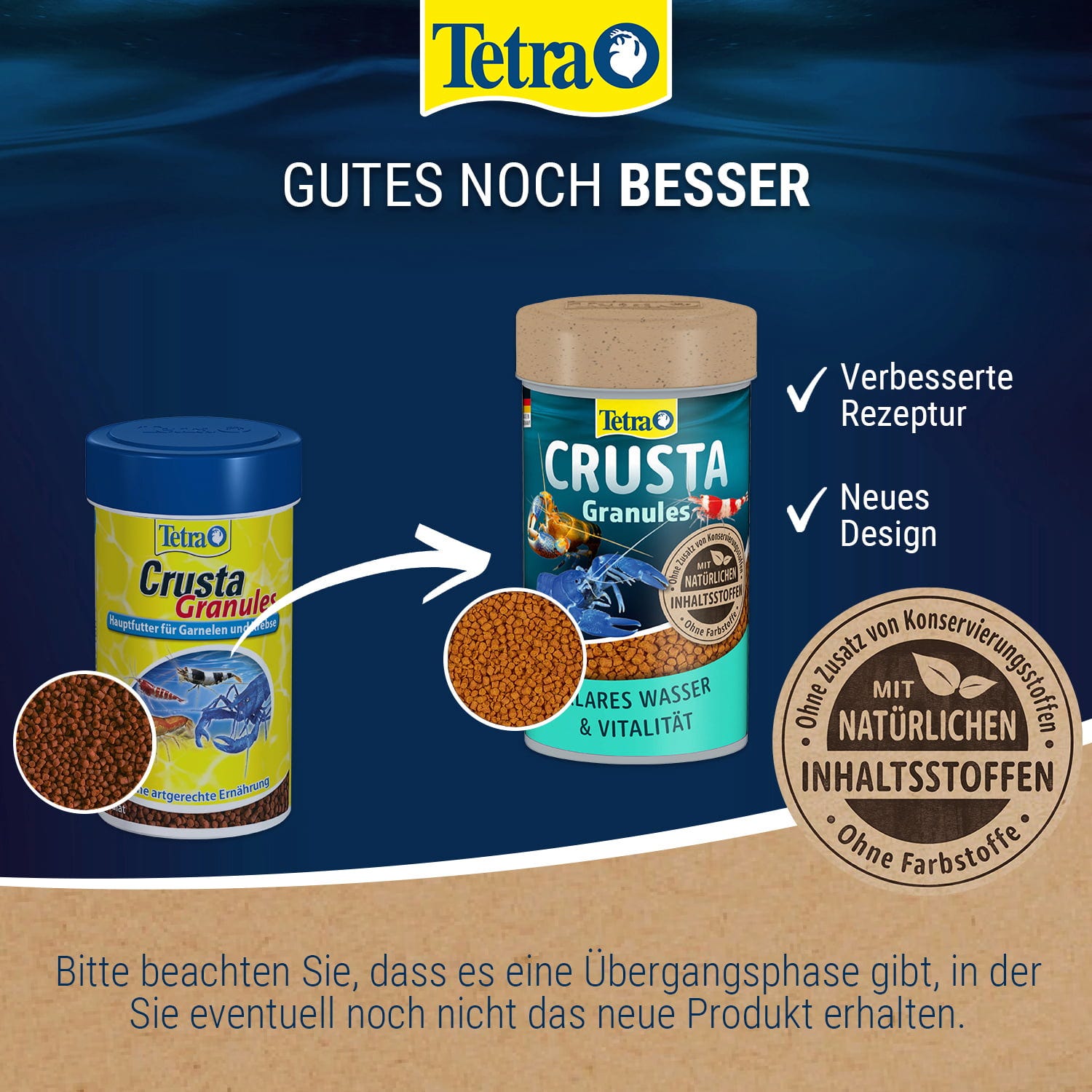 Krmivo Crusta zabezpečuje druhovo primeranú a pestrú stravu. Vďaka svojej rozmerovej stálosti umožňujú prirodzené kŕmenie kreviet a krabov a neznečisťujú vodu. Optimálny obsah bielkovín a minerálov zaisťuje zdravú výživu.