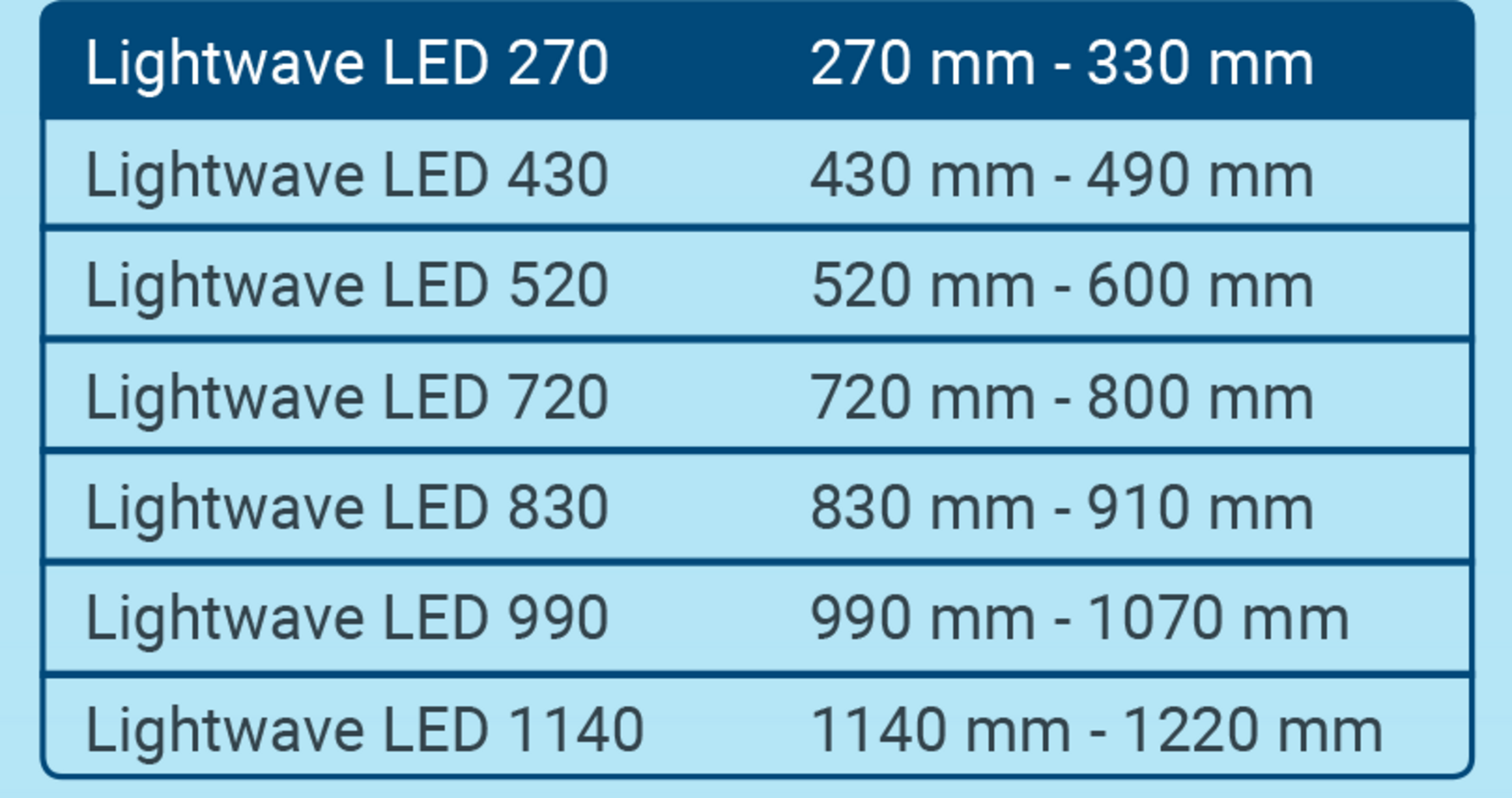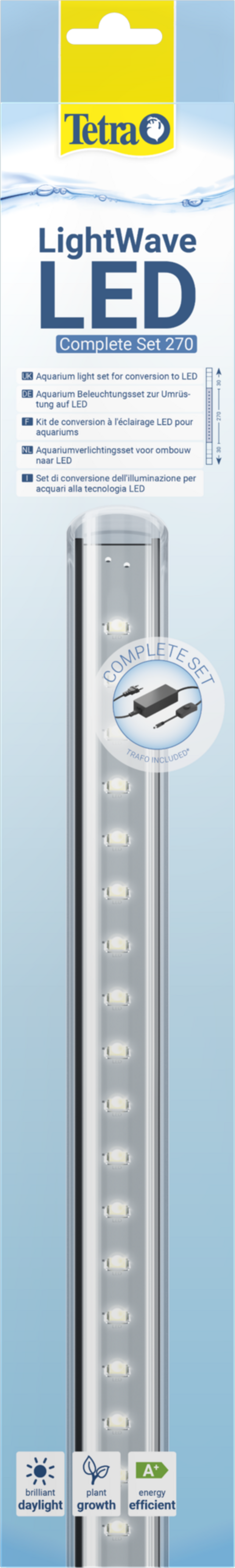 Kompletná sada LightWave je vhodná najmä na jednoduchý prechod na modernú LED technológiu. Kompletná sada obsahuje okrem napájacieho zdroja aj všetky potrebné adaptéry na pripevnenie a umožňuje tak okamžité uvedenie svietidla do prevádzky. Vysoký počet lúmenov LED svetla umožní, aby akvárium svietilo v prirodzenom a vynikajúcom dennom svetle. Svetelné spektrum lampy navyše stimuluje tvorbu chlorofylu, ktorý podporuje rast akváriových rastlín.