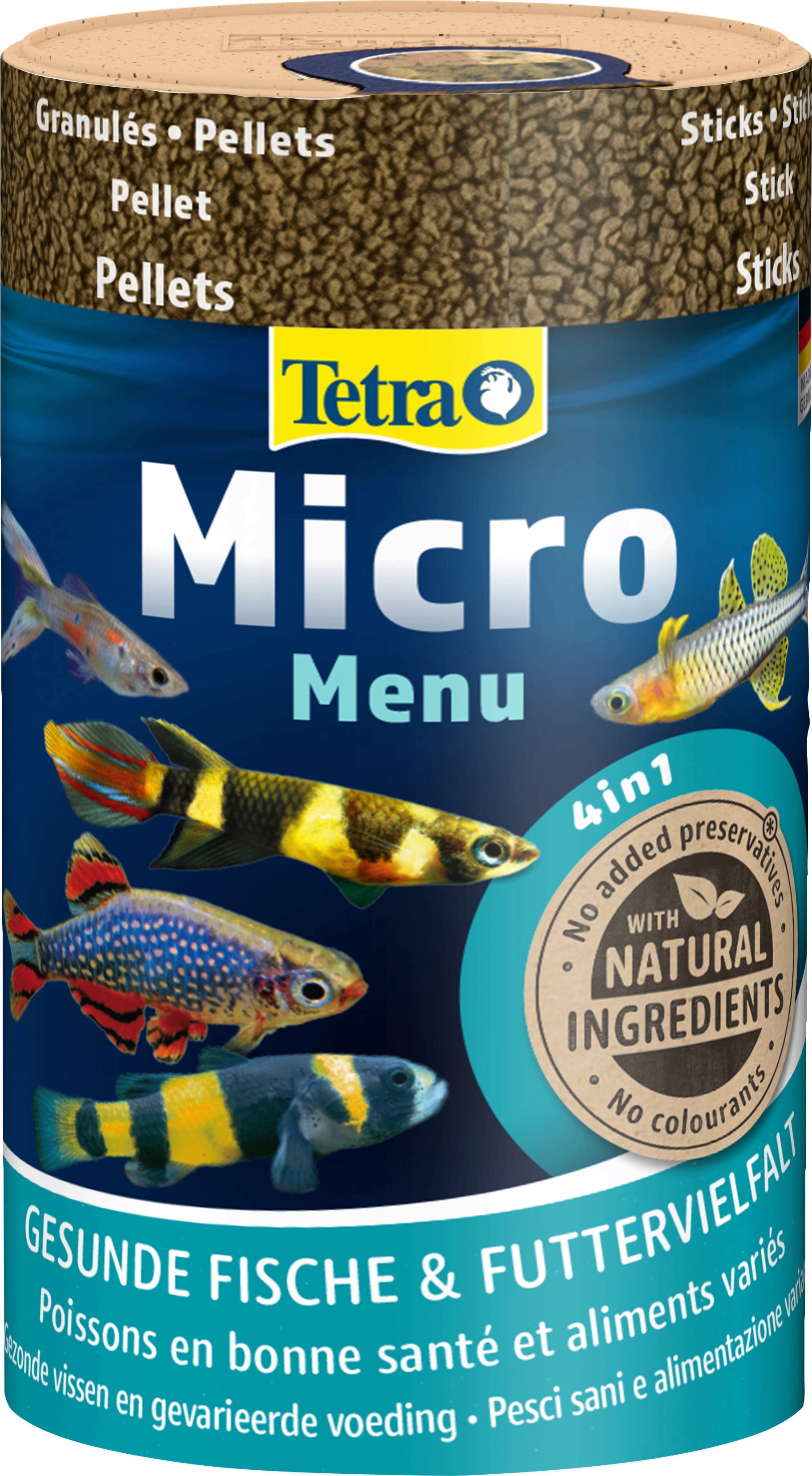 Vďaka inovatívnym výrobným procesom obsahujú štyri nové odrody všetky živiny, ktoré malé rybky s malými ústami potrebujú v najmenších dávkových formách. Granule, pelety, tyčinky a chrumky majú rôzne vlastnosti pri plávaní a potápaní - pre druhovo vhodné kŕmenie rýb v rôznych častiach vody. Pri tejto jemnej štruktúre a veľkosti je o to dôležitejšie, aby každý kus krmiva obsahoval správne množstvo kvalitných bielkovín, tukov, vitamínov a minerálov, aby boli zvieratá zdravé a fit. Preto odborníci zo spoločnosti Tetra vyvinuli toto mikro krmivo. Vďaka priemeru 0,3 a 2,5 mm sa odrody rýchlo rozmočia a môžu ich rýchlo prehltnúť ryby ako guppy, microrasbora a pod. Obsahujú jemne mleté zložky, ako sú karotenoidy pre žiarivé farby, ale aj rastlinné zložky pre zdravie, vitalitu a posilnenie imunitného systému. Micro Menu je perfektným riešením pre kŕmenie malých sladkovodných rýb! Praktický dávkovací box obsahuje šrubovací uzáver pre jednoduchý výber krmiva. Jedlo možno občas doplniť maškrtami ako napr. s FreshDelica.